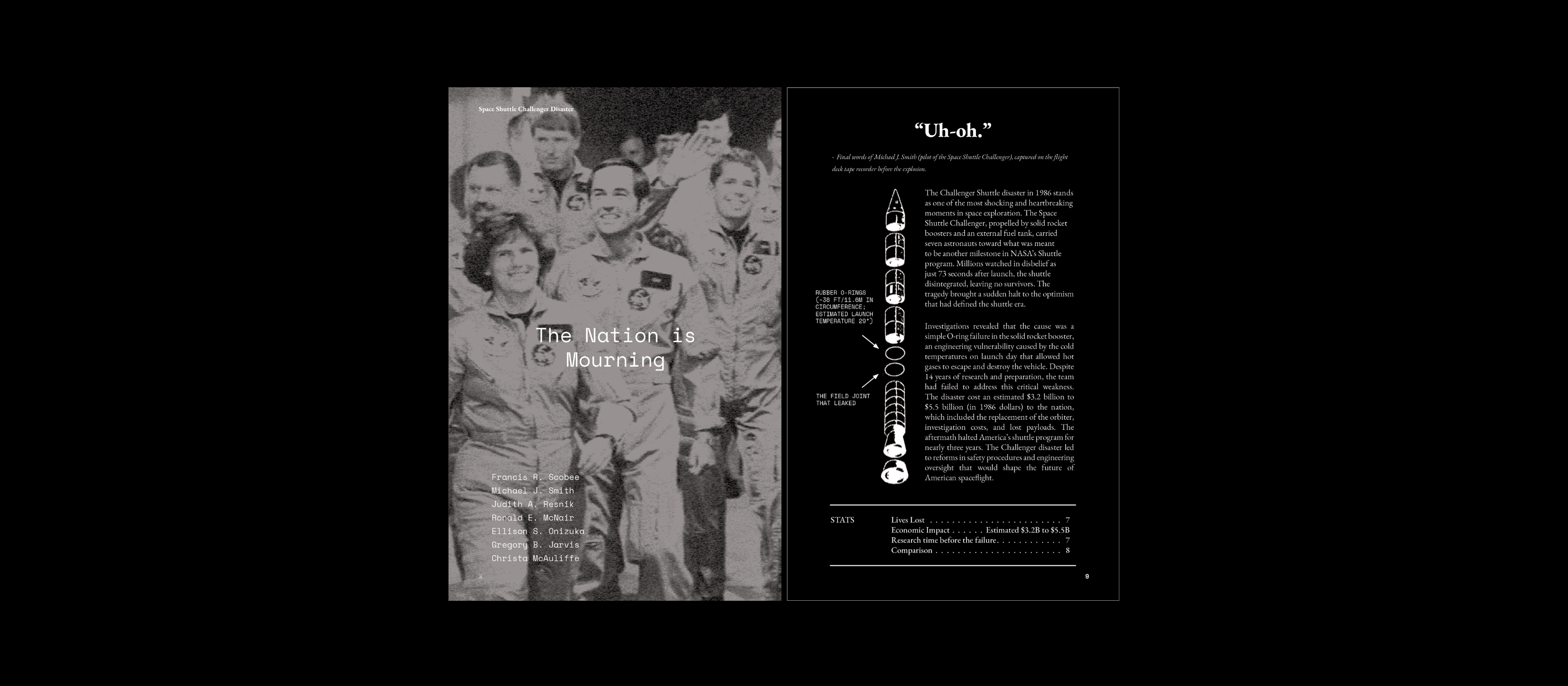 This data storytelling experience (a brochure handed out at an exhibition), developed in association with the California Institute of Technology sheds light on the human cost of systemic error, deception, political pressure, and overlooking the signs of truth in space exploration. It highlights how prioritizing political and public relations pressure over safety led to disaster, while honoring the courage of astronauts and engineers who unwillingly sacrificed their lives. It also explores the perils of ambition, from individuals and nations, as a fault. Rather than focusing on a single agency or nation, the project uses data from multiple space programs worldwide to create an international perspective.